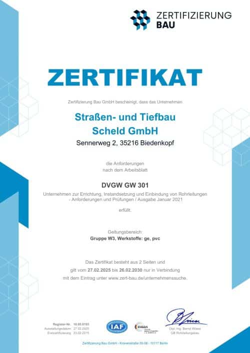 Durch die Zertifizierung nach dem DVGW-Arbeitsblatt GW 301 gewährleistet die Straßen- und Tiefbau Scheld GmbH durch regelmäßige Prüfungen den Nachweis, dass sie durch technische Fachkompetenz und Leistungsfähigkeit in der Lage ist eine technisch einwandfreie Verlegung von Rohrleitungen zu gewährleisten.